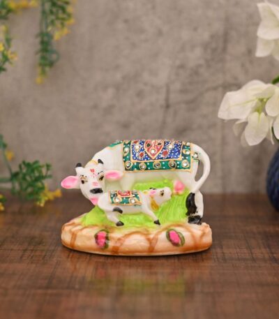 White Marble Kamdhenu Cow and Calf Statue (8.5 cm x 12 cm)