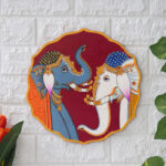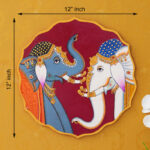 A beautiful pichwai artwork showcasing two majestic elephants with their trunks intertwined. The elephants stand on a wooden plate with a colorful floral border.
